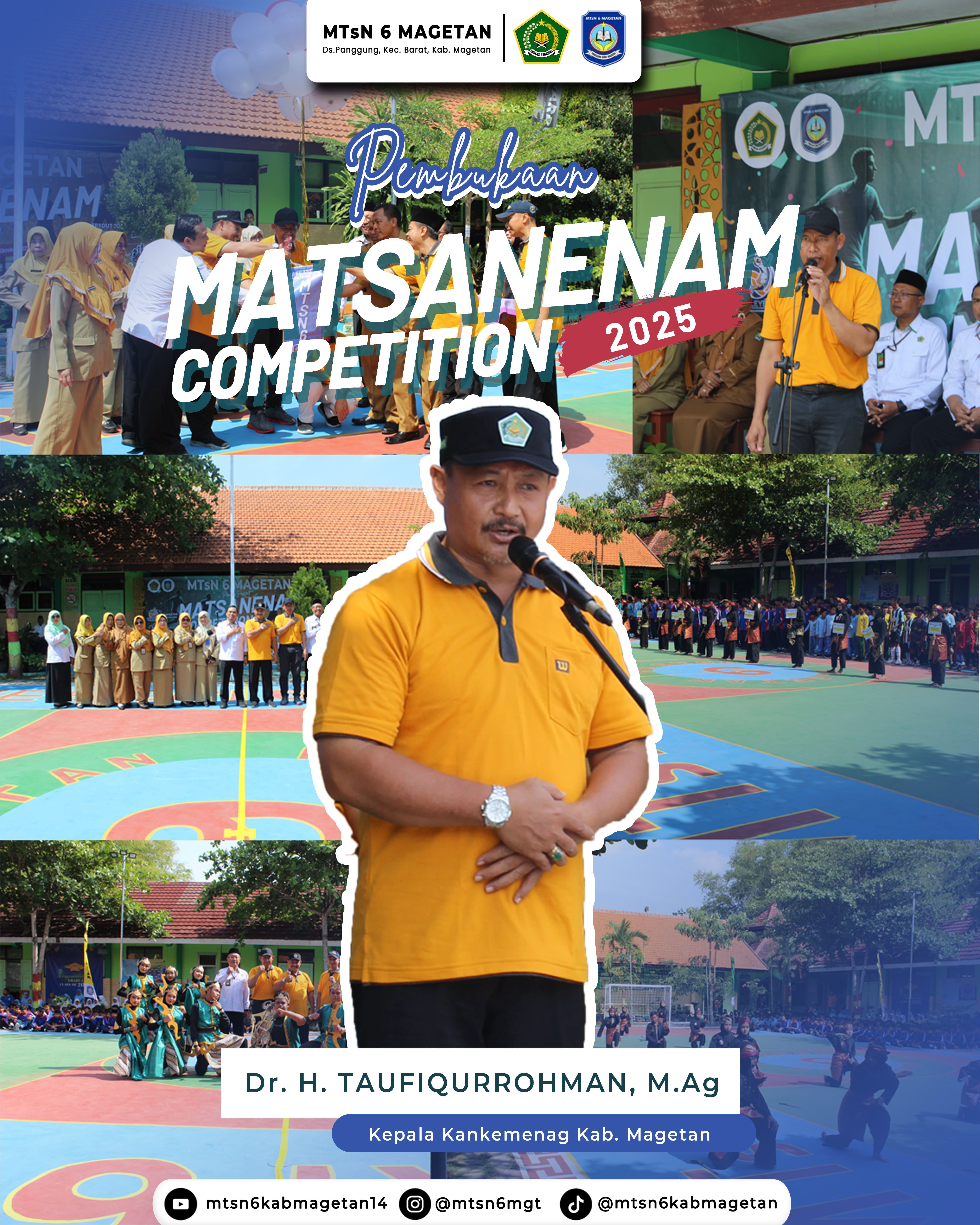 Madrasah Tsanawiyah Negeri 6 Magetan kembali menggelar agenda tahunan bertajuk MATSANENAM COMPETITION 2025. Kegiatan ini akan dilaksanakan pada 29 September hingga 4 Oktober 2025 dan bertempat di MTsN 6 Magetan. Ajang ini diikuti oleh peserta dari SD/MI se-Kecamatan Barat dan menjadi sarana kompetisi sekaligus silaturahmi antar sekolah dasar dan madrasah ibtidaiyah di wilayah tersebut.